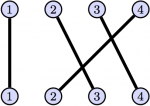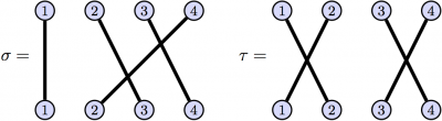 %%%%% % DEPENDENCIES % RequiredPackages \usepackage{tikz} %%%%% \begin{problem} The goal of this problem is to find a way to represent the symmetric group $S_n$ with diagrams. We will focus on $S_4$. \begin{enumerate} \item Which element of $S_4$ does the following diagram seem to represent? \[\begin{tikzpicture}[vertex/.style={circle,draw=black,fill=blue!15,thick,inner sep=1.5pt}, line width = 2] \foreach \i in {1,2,3,4} { \draw (\i,2) node[vertex] (top\i) {\footnotesize$\i$}; \draw (\i,0) node[vertex] (bottom\i) {\footnotesize$\i$}; } \draw (top1) -- (bottom1); \draw (top2) -- (bottom3); \draw (top3) -- (bottom4); \draw (top4) -- (bottom2); \end{tikzpicture}\] \item What is the diagram for the inverse of the previous element. \item Formulate a diagrammatic rule for finding the diagram of the inverse of an element of $S_4$. \item What is the diagram for the identity. \item Consider $\sigma,\tau\in S_4$ whose diagrams are given below. Determine the diagrams for $\sigma\tau$ and $\sigma\tau$. \[\sigma = \begin{tikzpicture}[baseline= (current bounding box.west),vertex/.style={circle,draw=black,fill=blue!15,thick,inner sep=1.5pt}, line width = 2] \foreach \i in {1,2,3,4} { \draw (\i,2) node[vertex] (top\i) {\footnotesize$\i$}; \draw (\i,0) node[vertex] (bottom\i) {\footnotesize$\i$}; } \draw (top1) -- (bottom1); \draw (top2) -- (bottom3); \draw (top3) -- (bottom4); \draw (top4) -- (bottom2); \end{tikzpicture}\quad\quad \tau = \begin{tikzpicture}[baseline= (current bounding box.west),vertex/.style={circle,draw=black,fill=blue!15,thick,inner sep=1.5pt}, line width = 2] \foreach \i in {1,2,3,4} { \draw (\i,2) node[vertex] (top\i) {\footnotesize$\i$}; \draw (\i,0) node[vertex] (bottom\i) {\footnotesize$\i$}; } \draw (top1) -- (bottom2); \draw (top2) -- (bottom1); \draw (top3) -- (bottom4); \draw (top4) -- (bottom3); \end{tikzpicture}\] \item Formulate a diagrammatic rule for finding the diagram of the composition of two elements of $S_4$. \item Find a $\sigma \in S_4$ such that $\sigma$ is not the identity but $\sigma^2$ is the identity. Find $5$ more (different) elements in $S_4$ with the same property. \item Find a $\sigma \in S_4$ such that $\sigma$ is not the identity but $\sigma^3$ is the identity. \end{enumerate} \end{problem}